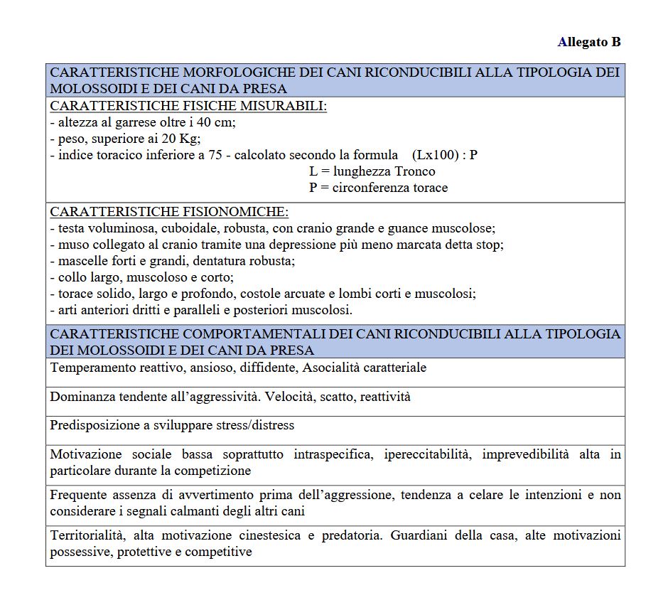 “I cani in save list rispondono alle caratteristiche morfologiche (Allegato B, nella foto sotto) descritte dalla proposta di legge parlamentare, che la Lombardia trasmetterà alle Camere”. Nel caso entrasse in vigore il provvedimento ci sarebbe anche la registrazione nel ‘Sistema informativo identificazione nazionale degli animali da compagnia’ (Sinac) dei patentini rilasciati e delle valutazioni psico-fisiche dei cani, nonché dei provvedimenti disposti a carico di coloro che si rifiutano di partecipare al percorso formativo obbligatorio. Secondo i dati riportati dal relatore e consigliere Roberto Anelli (Lega), primo firmatario, sul territorio lombardo si verificano 4 episodi di morsicatura al giorno, per un totale di 1.466 casi nell’ultimo anno. Nel 99% dei casi si tratta di cani non iscritti al libro genealogico.