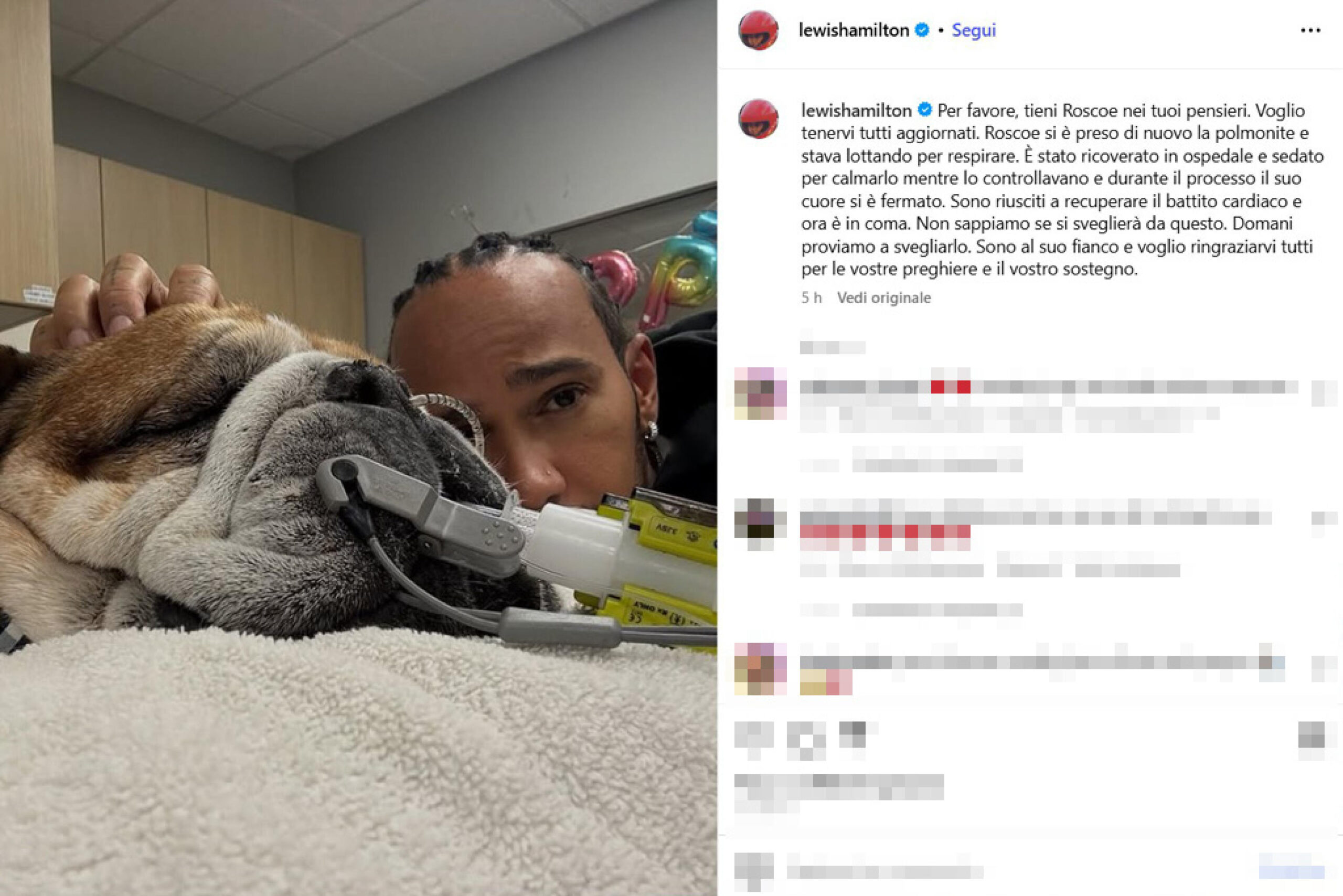 “Roscoe è morto domenica sera, 28 settembre tra le mie braccia”. Lewis Hamilton racconta sui social la morte del suo cane, un bulldog di tredici anni. “Dopo quattro giorni di lotta, combattendo con tutte le forze che aveva, ho dovuto prendere la decisione più difficile della mia vita e dire addio a Roscoe. Non ha smesso mai di combattere, fino alla fine. Mi sento così grato e onorato di aver condiviso la mia vita con un’anima così bella, un angelo e un vero amico. Portare Roscoe nella mia vita è stata la decisione migliore che abbia mai preso e conserverò per sempre i ricordi che abbiamo creato insieme”, ha scritto il pilota Ferrari. Il bulldog era stato colpito da una polmonite in primavera e nei giorni scorsi ci sarebbe stata una recrudescenza, che gli impediva di respirare. Sedato, “il suo cuore si è fermato, i medici sono riusciti a recuperare il battito cardiaco ma Roscoe è finito in coma”, scriveva Hamilton venerdì scorso, allegando la foto in alto sui suoi social. Domenica la decisione di lasciarlo andare.