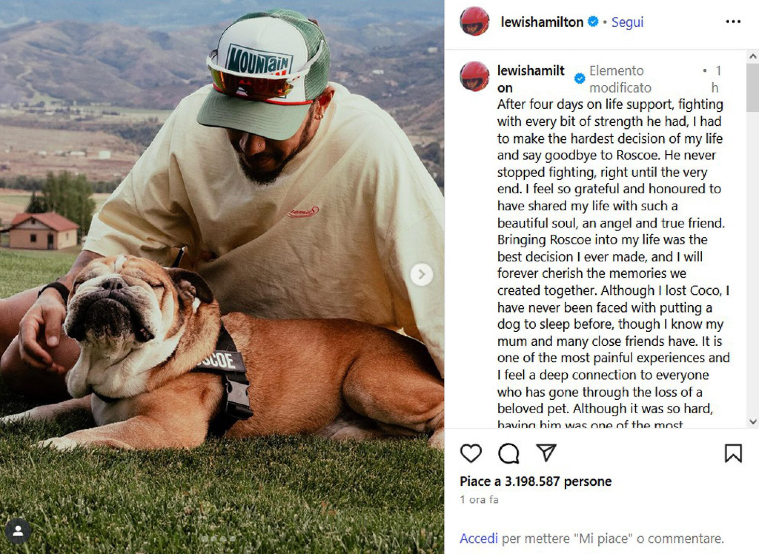 “Anche se ho perso Coco (nella foto sopra), non mi è mai capitato di dover addormentare un cane prima, anche se so che mia madre e molti amici intimi lo hanno fatto. È una delle esperienze più dolorose e sento un profondo legame con tutti coloro che hanno vissuto la perdita di un amato animale domestico. Anche se è stato così difficile, averlo è stata una delle parti più belle della vita, amare così profondamente ed essere amati in cambio – ha concluso Hamilton -. Grazie a tutti per l’amore e il supporto che avete dimostrato a Roscoe nel corso degli anni. È stato davvero speciale assistere e provare emozioni”. Il cane ha accompagnato il britannico in sei delle sue stagioni da campione con la Mercedes, assisteva regolarmente alle gare con il suo pass paddock e viaggiava sul jet privato. Roscoe ha 1,2 milioni di follower su Instagram e Hamilton, nel 2016, ha fatto congelare il suo seme per poter avere degli eredi dell’amato bulldog.