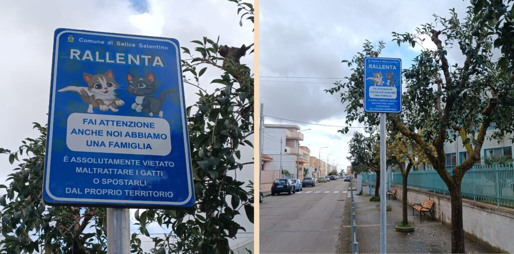 “Rallenta. Fai attenzione. Anche noi abbiamo una famiglia”. È l’avviso impresso sui nuovi cartelli stradali installati dal Comune di Salice Salentino, in provincia di Lecce, a tutela dei gatti che vivono nel centro del paese, oltre che dei cittadini. Sono circa venti i nuovi pali dislocati nei punti dove si sono verificati più frequentemente incidenti che hanno coinvolto animali e dove sono presenti colonie feline. Accanto alla dicitura che invita alla prudenza, è indicato anche il divieto di maltrattare i gatti o spostarli dal loro territorio, con disegni raffiguranti due gattini, insieme al logo del Comune.