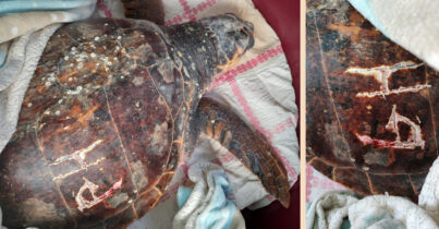 • Iniziali incise sul carapace di una tartaruga marina: “Barbarie e crudeltà”